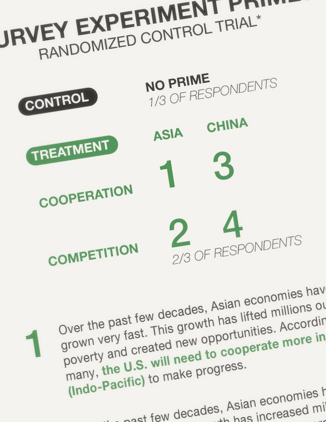 One-third of respondents received no prime (message). The remaining respondents received one of four primes (such as statements that the U.S. will need to compete more with China or cooperate more in Asia). Each respondent was randomly assigned a message. This made it possible to measure the casual impact of receiving different messages.