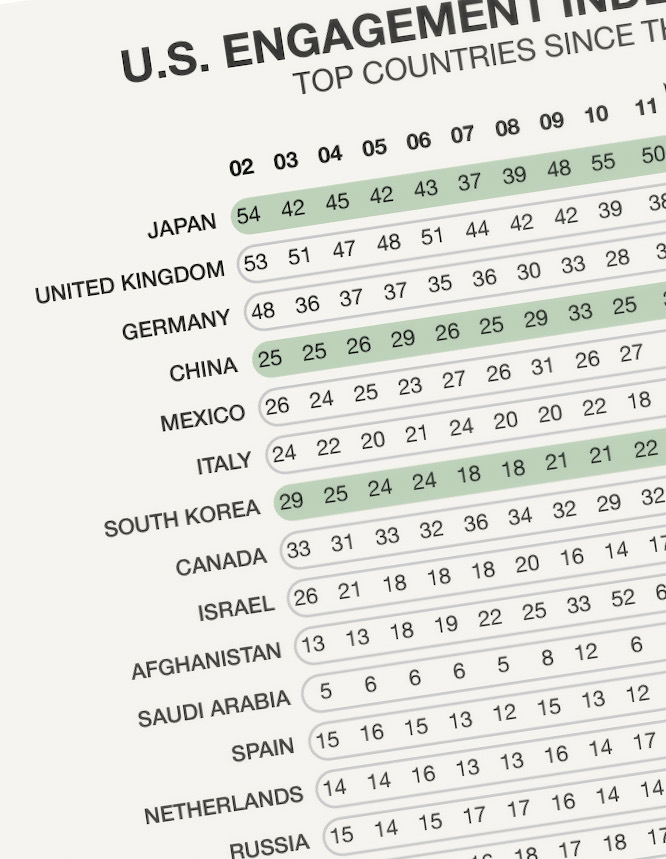 The index accounts for each investment type. By compiling a range of diplomatic, military, and economic investments into one index, I was able to see how U.S. engagement with individual countries and regions has evolved.
